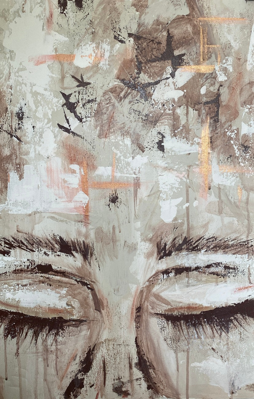 This piece I created using a painters knife and I really enjoyed created facial features using this technique. I wanted to add dimension to the piece so I split the face in half. The rose gold represents femininity and how women shine.